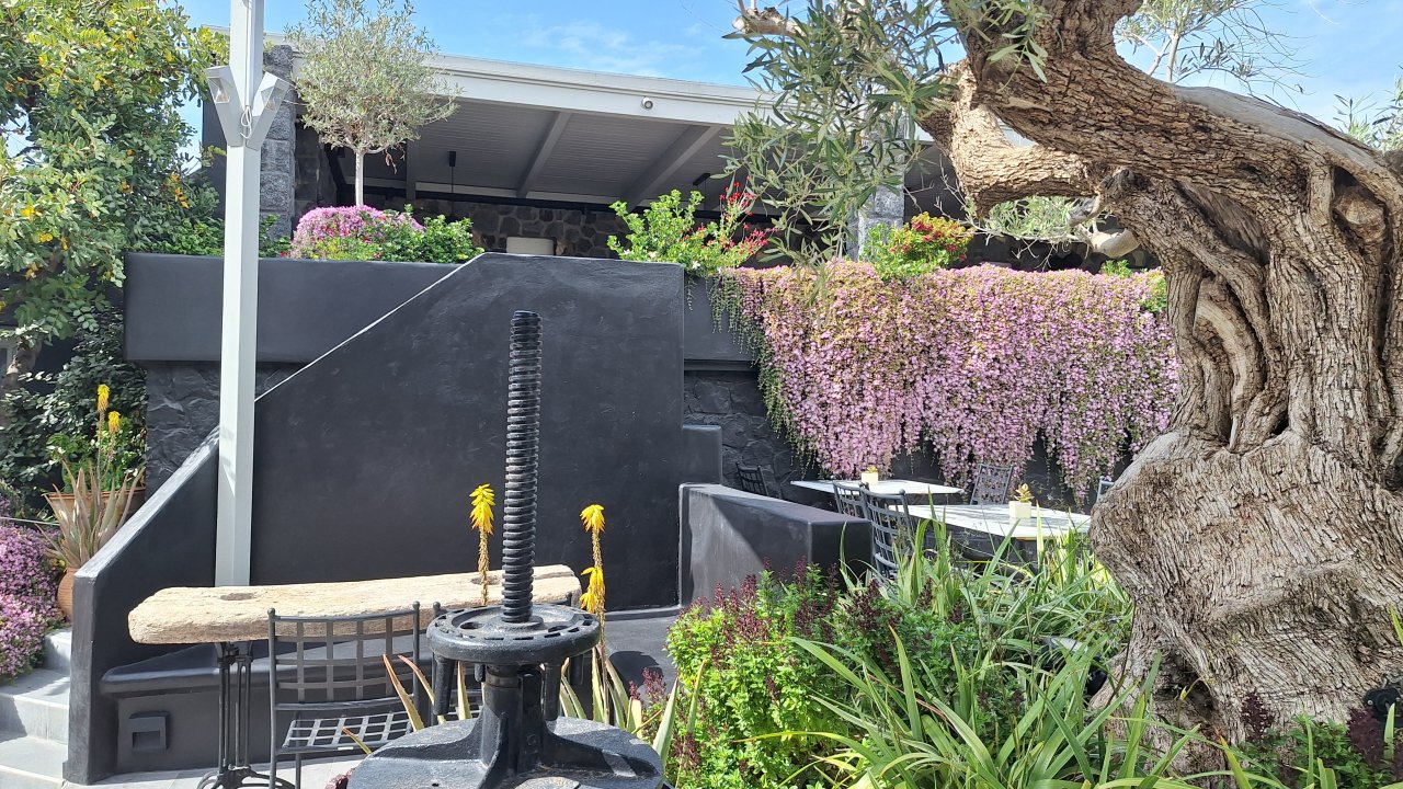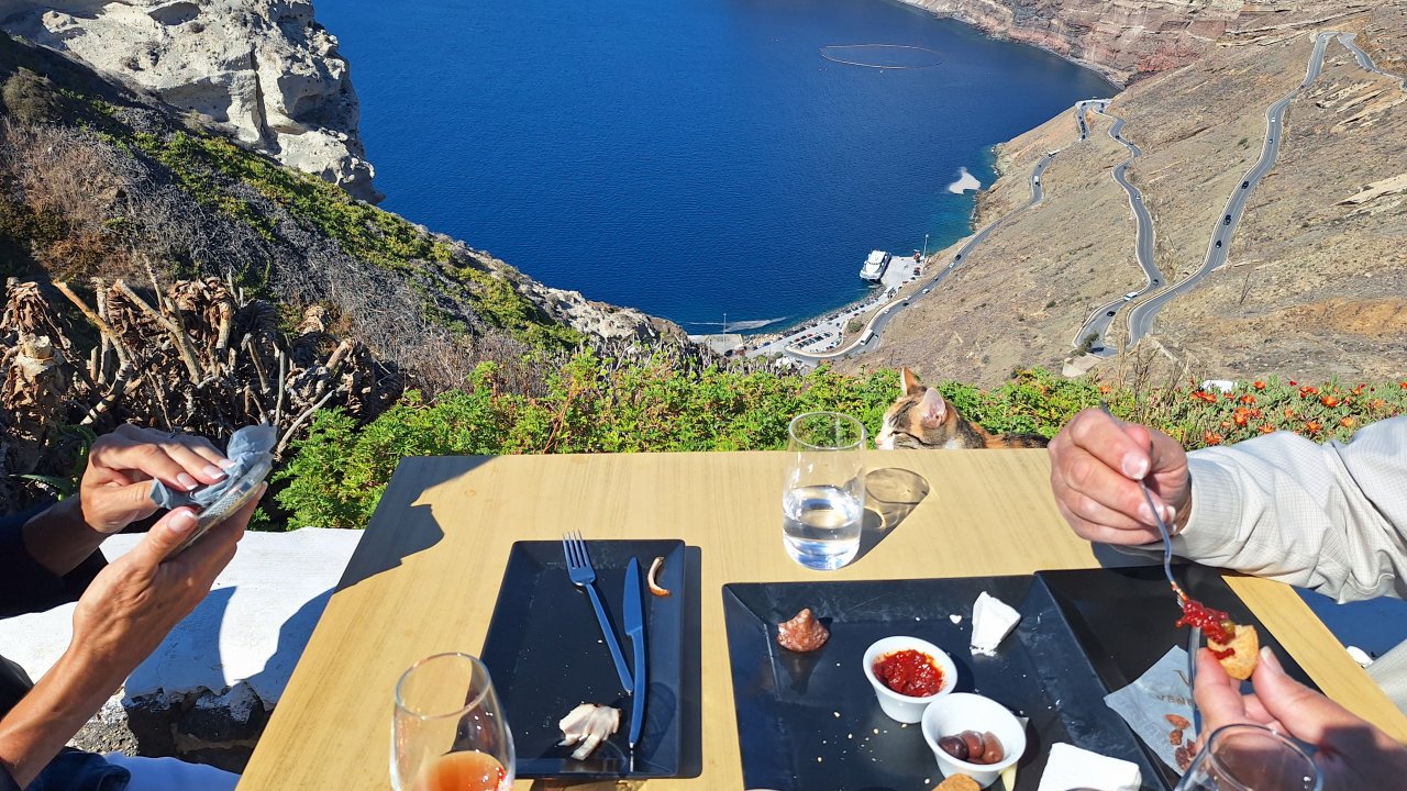 - Caldera views and terrace setting at Venetsanos Winery